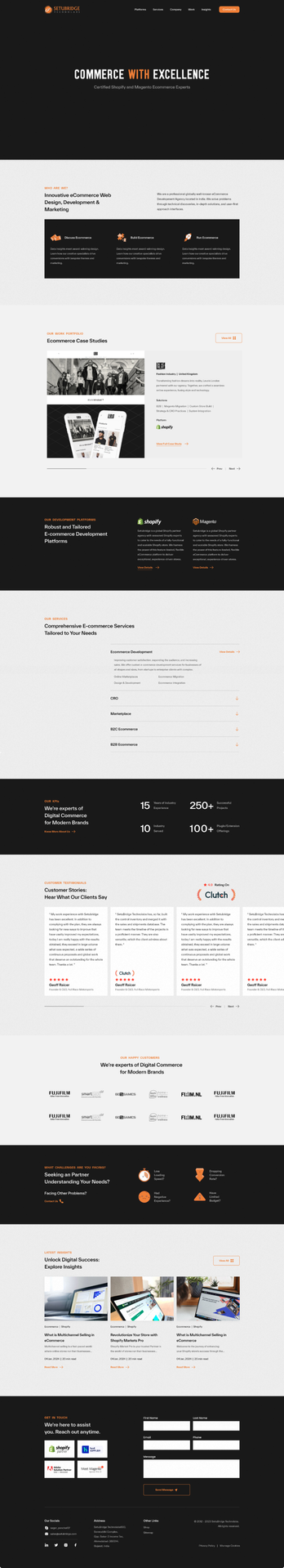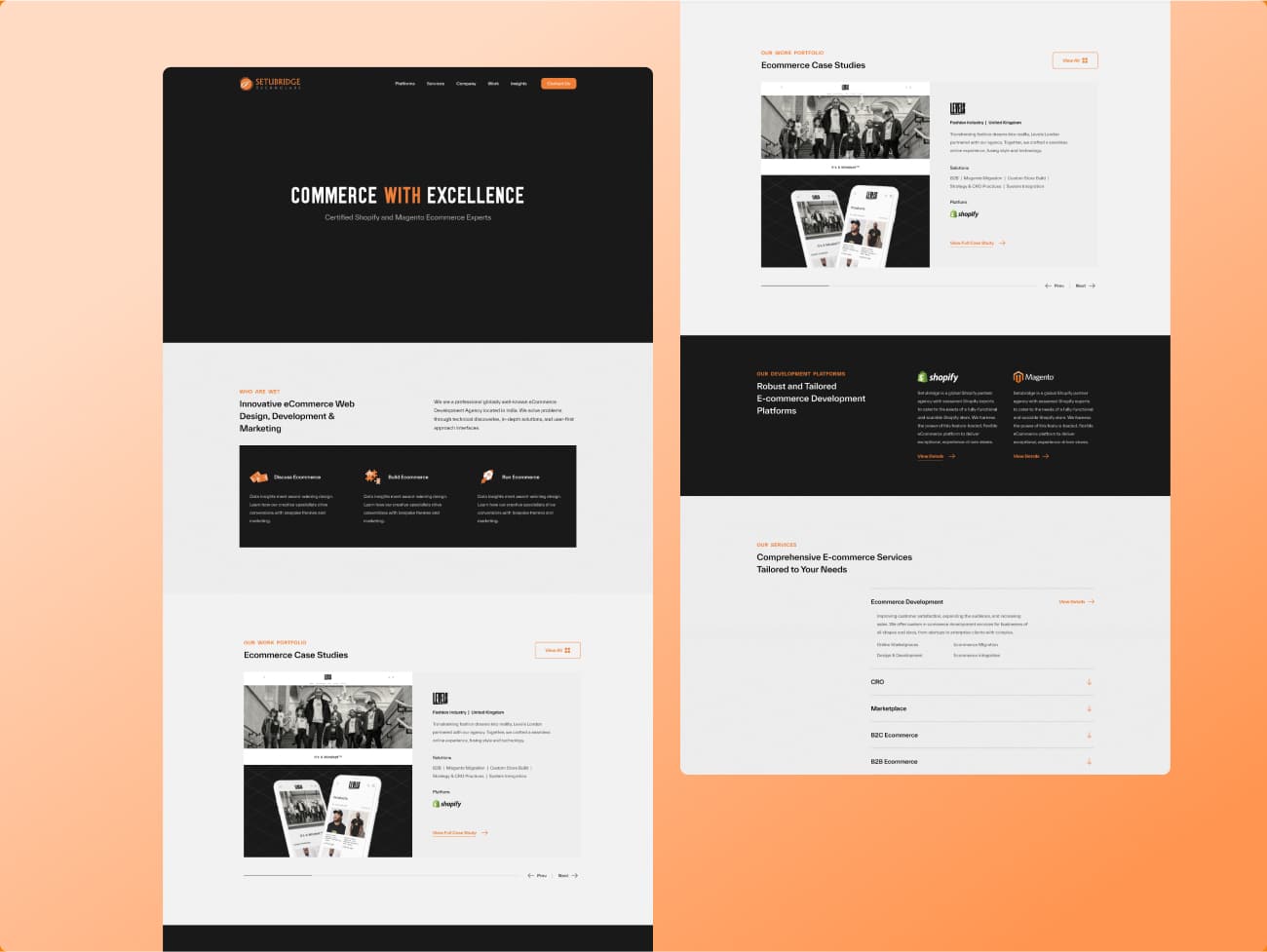 SetuBridge specializes in crafting ecommerce solutions tailored to the unique needs of businesses, leveraging platforms like Magento and Shopify. With a commitment to innovation and excellence, SetuBridge empowers clients to thrive in the digital marketplace by providing strategic, user-centered ecommerce solutions. However, their previous website did not fully reflect their expertise and lacked the modern design and functionality needed to engage prospective clients. SetuBridge required a redesign to align with current digital trends, improve usability, and effectively communicate their capabilities in the ecommerce solutions industry.
