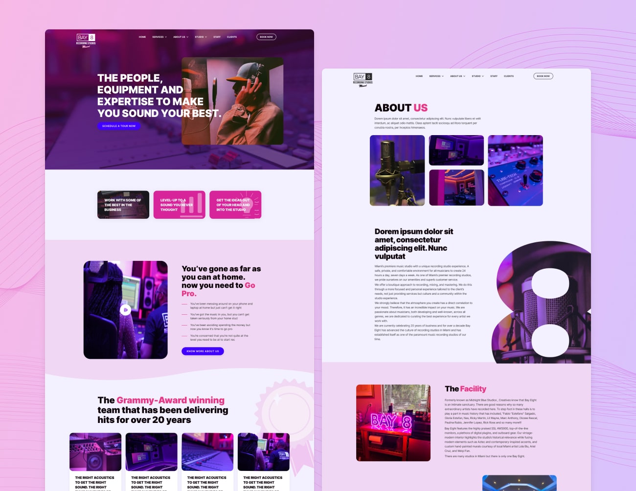 For the UI design, we chose a refined, modern aesthetic that captures the essence of BayEight’s brand. The color scheme and typography were carefully selected to reflect the studio’s professional and welcoming environment. High-quality imagery of the studio’s interiors, equipment, and award-winning staff added depth to the design, creating an immersive digital experience. Each design element was crafted to evoke a sense of quality, creativity, and warmth.